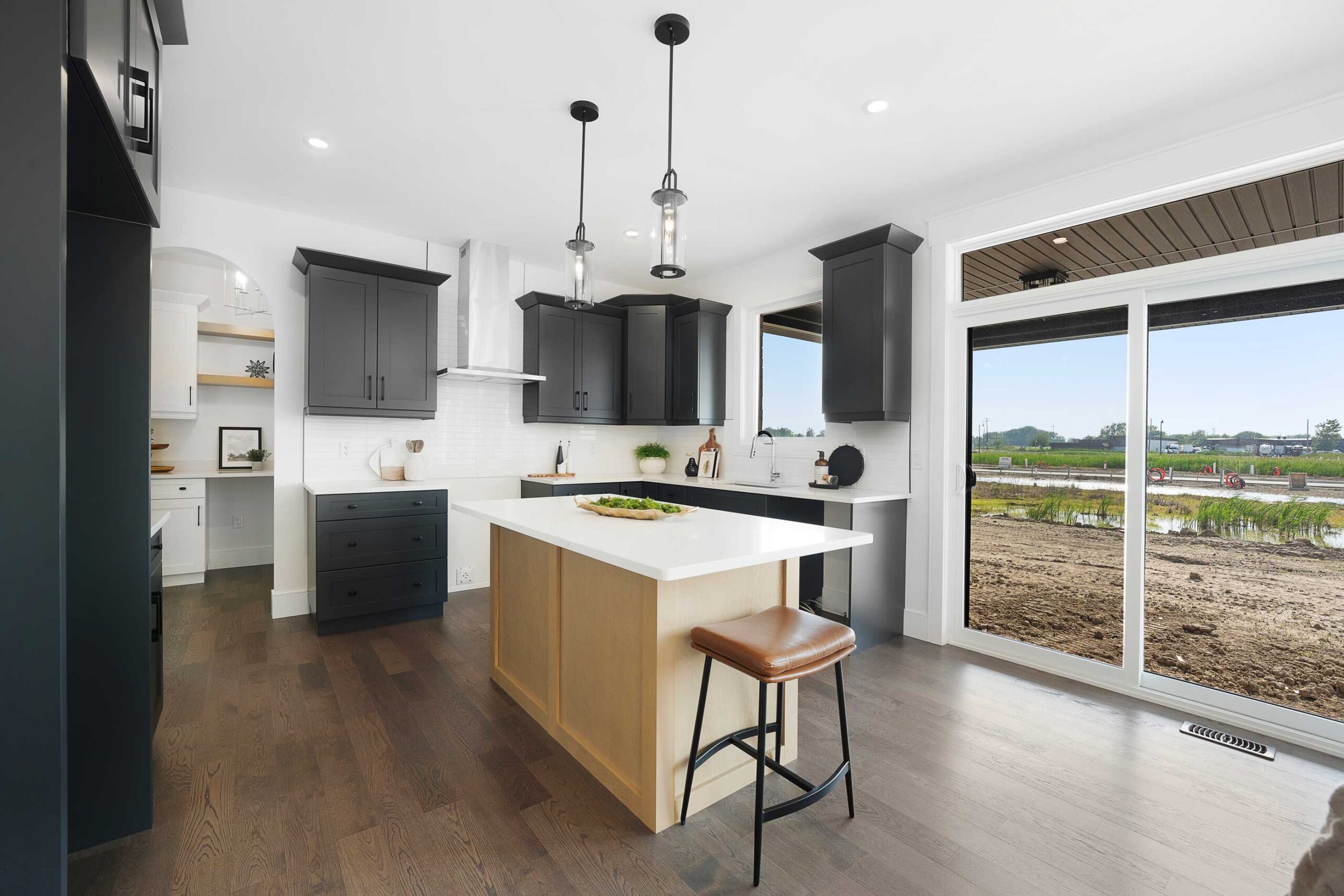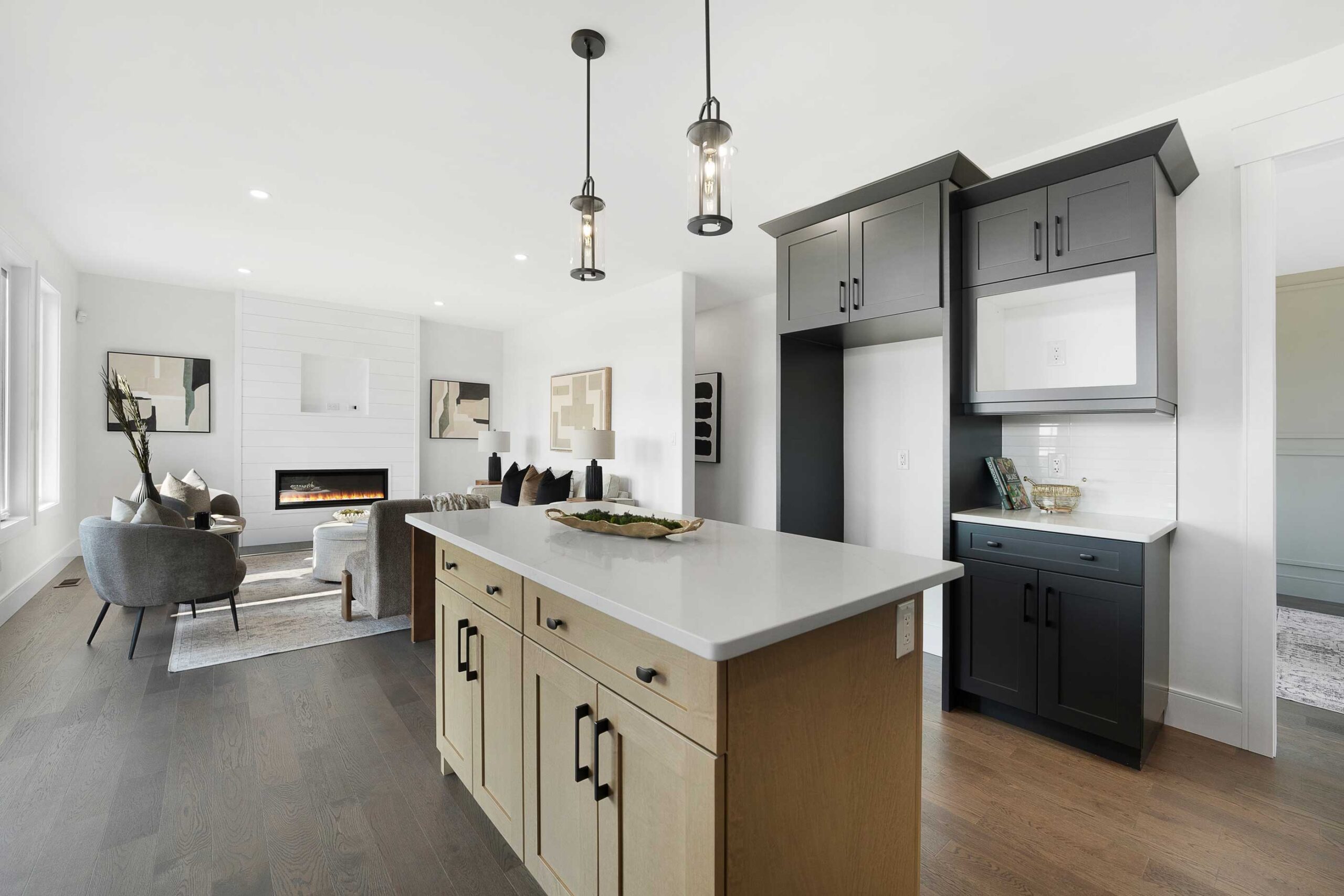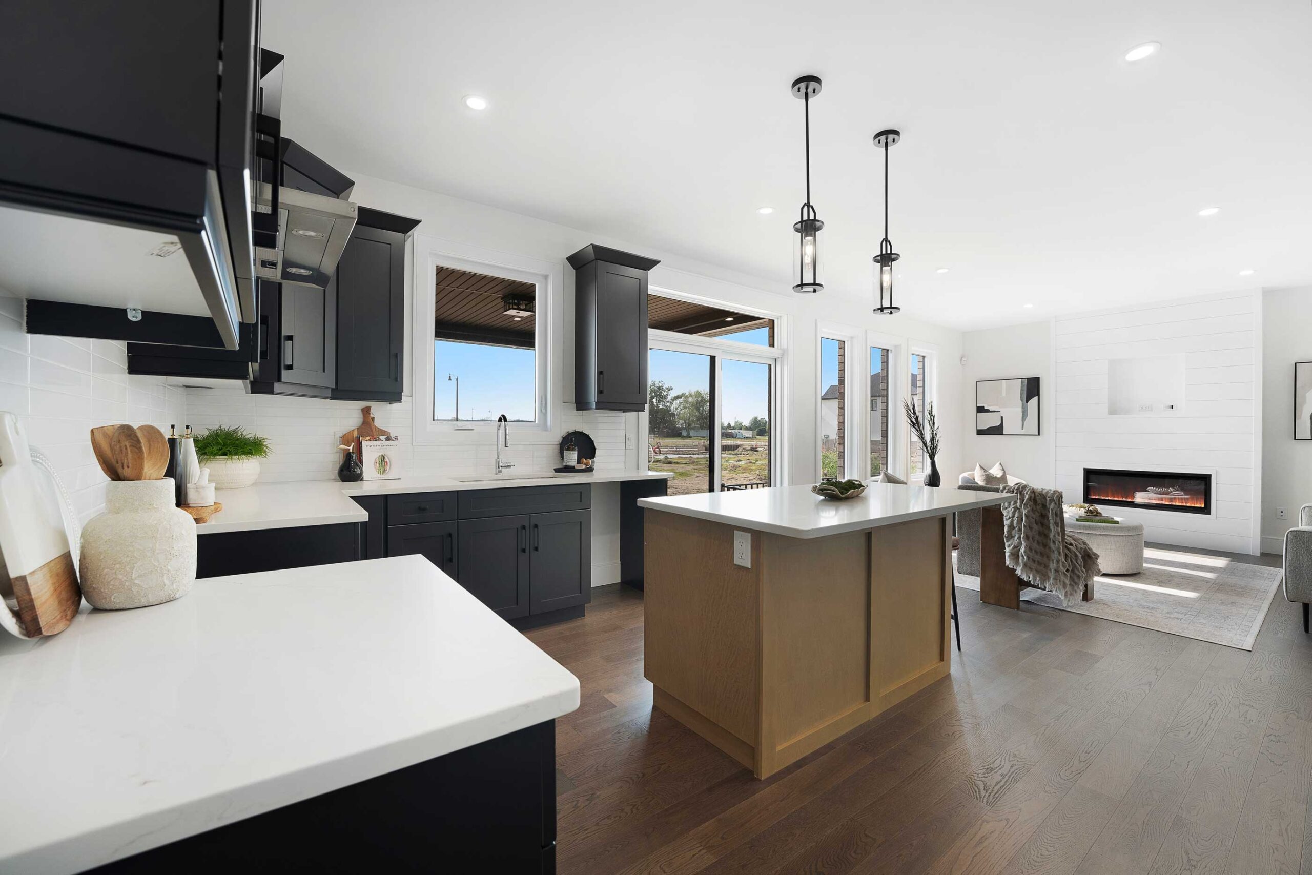 Inside, 9 ft main floor ceilings enhance the open-concept layout. The kitchen is designed for both style and function, featuring a large centre island, granite or quartz countertops, a walk-in pantry, butler’s server area, and an arched entryway that adds architectural interest. The main floor also includes a dedicated office and a comfortable family room with an electric fireplace. Finishes continue with engineered hardwood flooring and hardwood in bedrooms, complemented by tray ceilings in the primary suite.