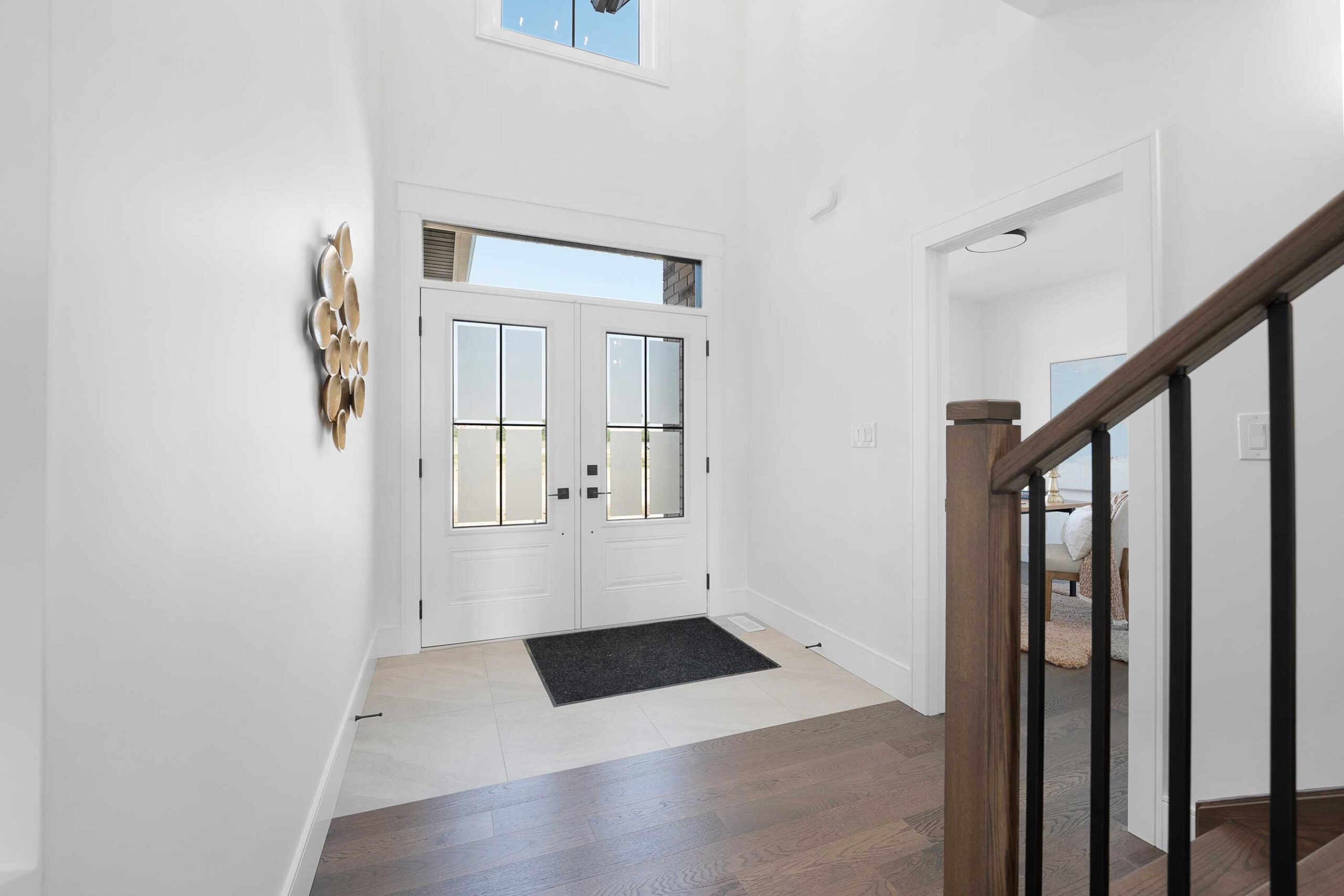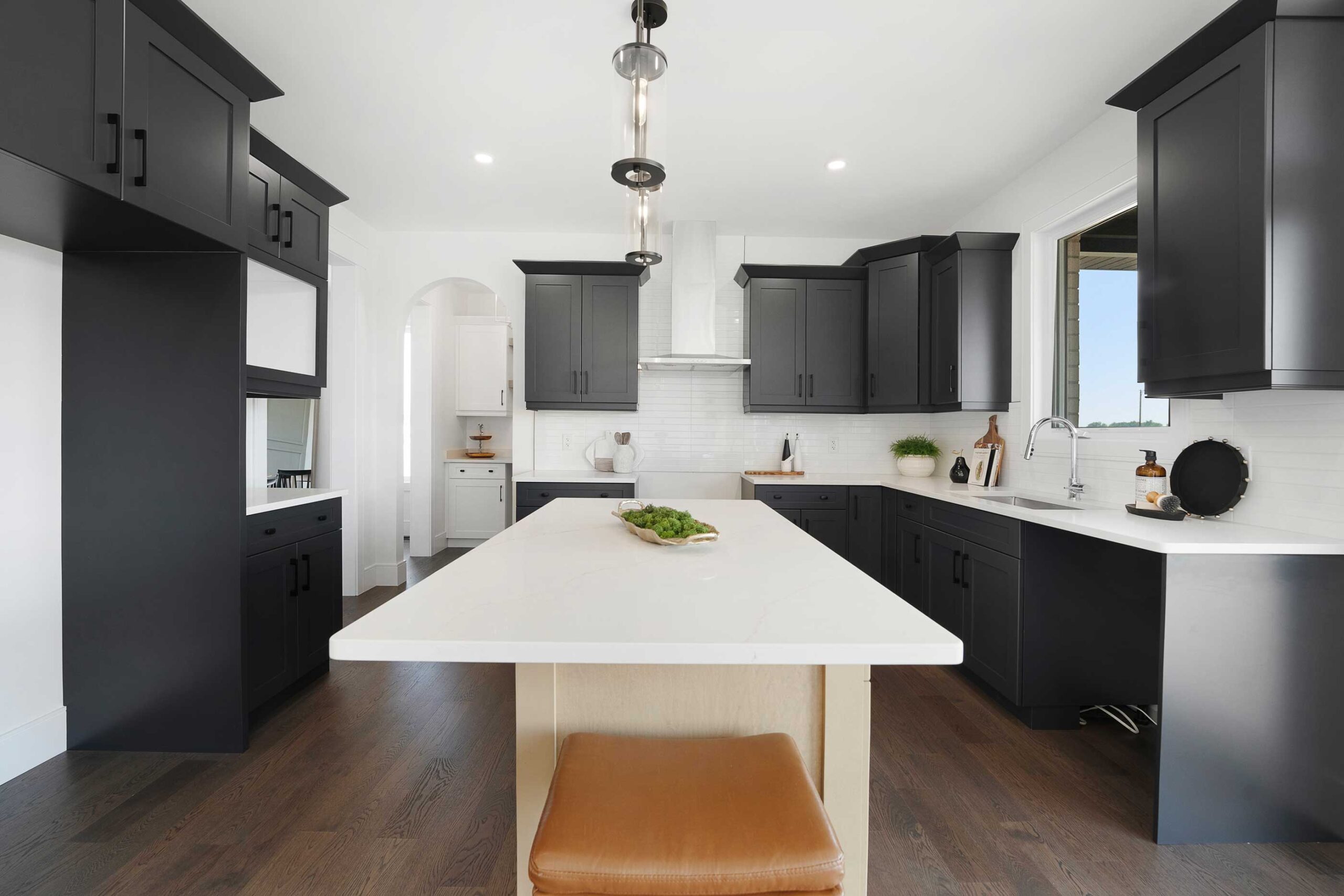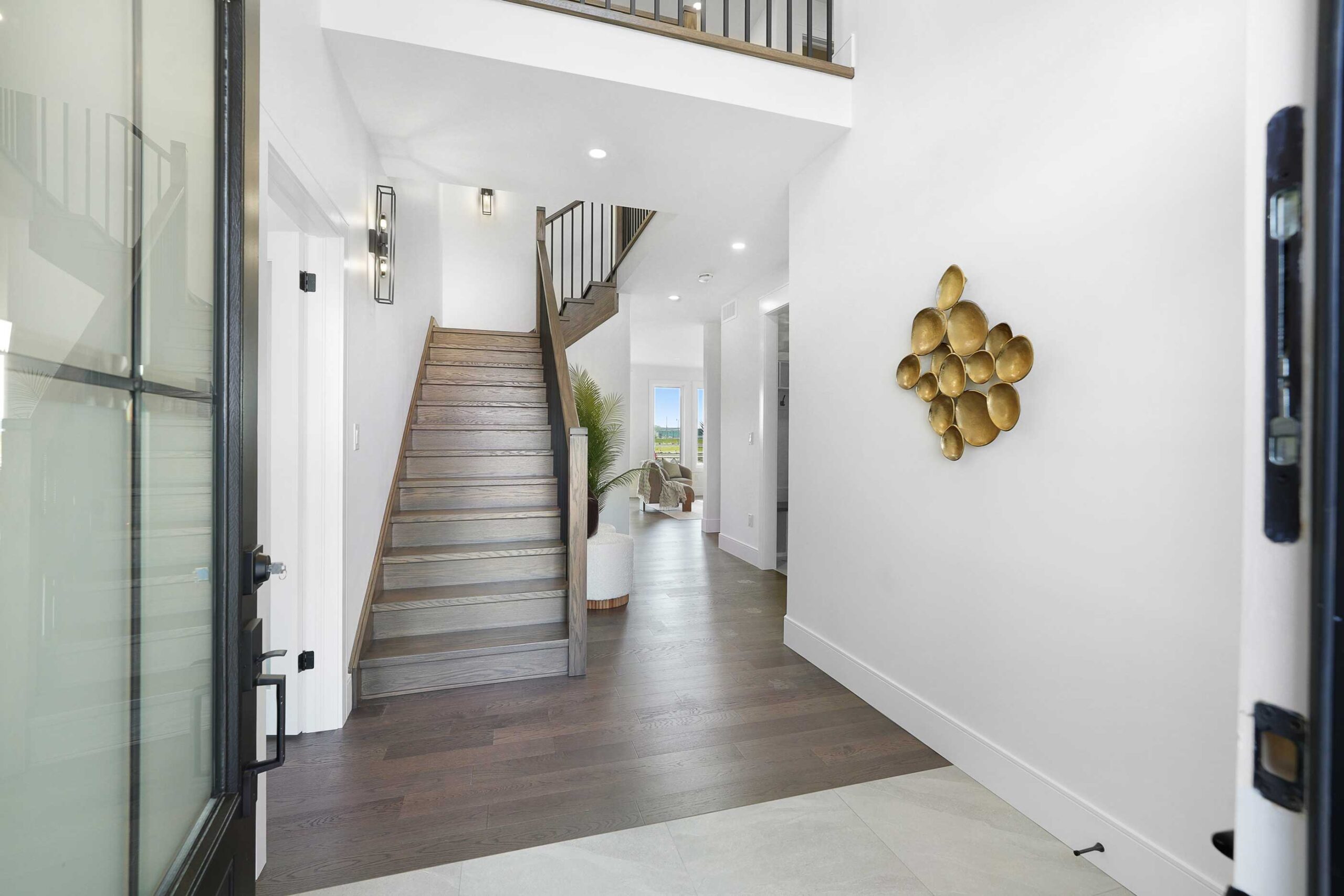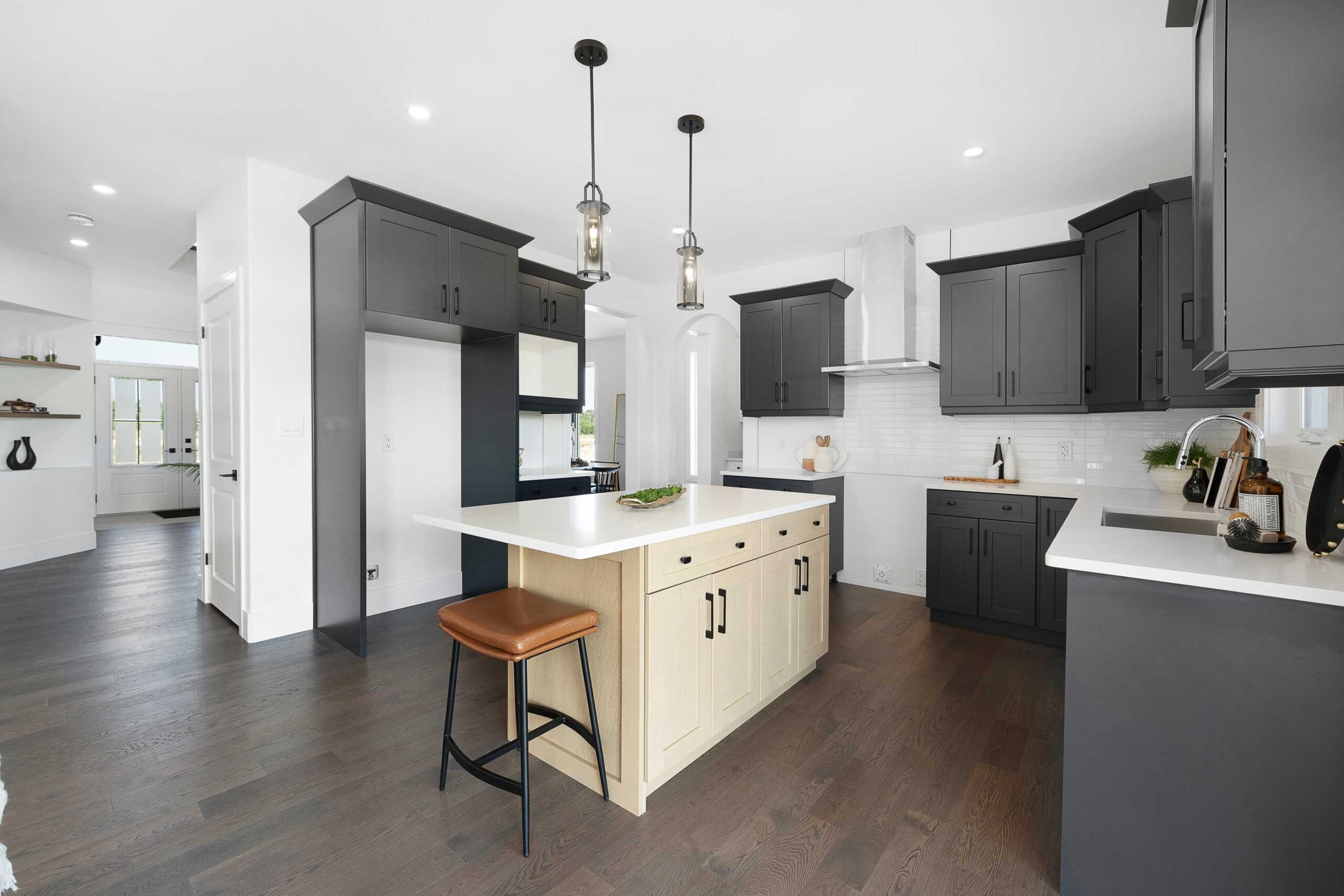 Inside, 9 ft main floor ceilings enhance the open-concept layout. The kitchen is designed for both style and function, featuring a large centre island, granite or quartz countertops, a walk-in pantry, butler’s server area, and an arched entryway that adds architectural interest. The main floor also includes a dedicated office and a comfortable family room with an electric fireplace. Finishes continue with engineered hardwood flooring and hardwood in bedrooms, complemented by tray ceilings in the primary suite.
